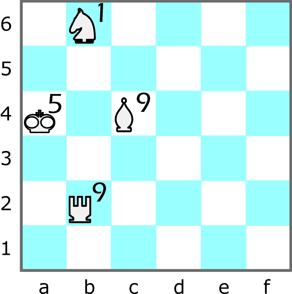 Skoczek na a2, wieża na a1, król na b1 i goniec na c1 dają w tej kolejności liczby 2, 0, 2, 5