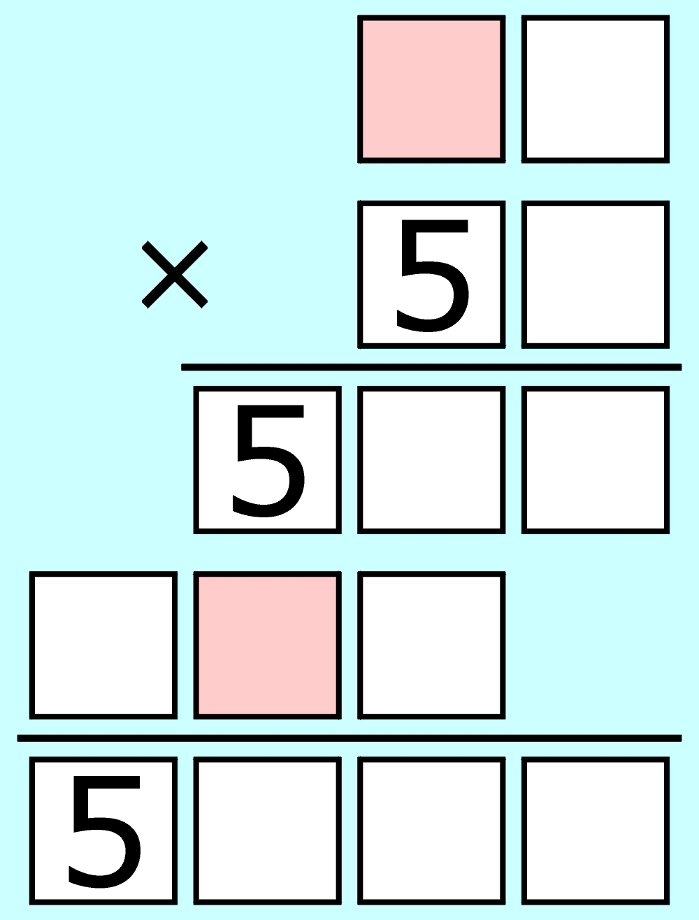 W każdym roku jeden „piątek trzynastego” być musi – tak było w minionym roku (13 czerwca) i tak będzie w 2027 (13 sierpnia). Na szczęście więcej niż trzy pechowe piątki być nie mogą, a niepechowe stanowią tytuł tego wpisu oraz ujawnione są w poniższym szkieletowym mnożeniu. Chodzi oczywiście o rozszyfrowanie działania, w zapisie którego występują jeszcze tylko dwie cyfry nieparzyste (różowe kratki) – obie są jednakowe, ale nie są to piątki.