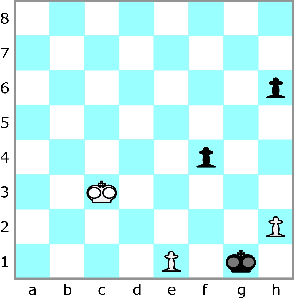 W poniższym zadaniu zaczynają i wygrywają białe. W ilu ruchach – tego dokładnie nie wiadomo, ale jak najszybciej. Obie strony powinny wykonywać najlepsze posunięcia, a partia kończy się, gdy czarne nie będą mogły wykonać ruchu. Gwoli czytelności pozycji w rolę bierek warcabowych wcieliły się szachowe.