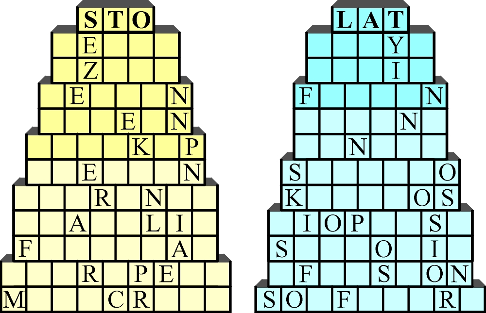 Przypominam, że 3-literowe słowo u góry piramidki jest kluczem do rozszyfrowania słów w pozostałych rzędach. W puste kratki w każdym rzędzie należy wpisywać tylko te litery, które tworzą to górne 3-literowe słowo – każdą przynajmniej raz. Innych liter wpisywać nie wolno. Wpisane litery powinny wraz z ujawnionymi utworzyć w rzędach piramidek po 11 wyrazów.